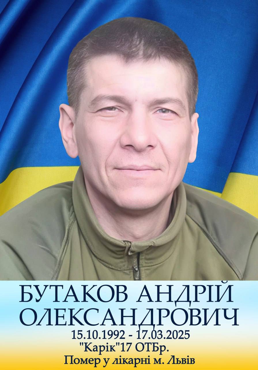 Війна, з якою загарбницька росія прийшла на територію України, забрала життя марганчанина, Героя - Андрія Олександровича Бутакова, 26.10.1978 р.н. Позивний «Карік». Служив у 17 ОТБр, старший сержант, командир танку. Отримав поранення 22.06.2022 року у н.п. Підлісне, Луганської області. Лікарі боролися за його життя 3 місяці і помер Бутаков Андрій 29.09.2022 року у лікарні м. Львів.